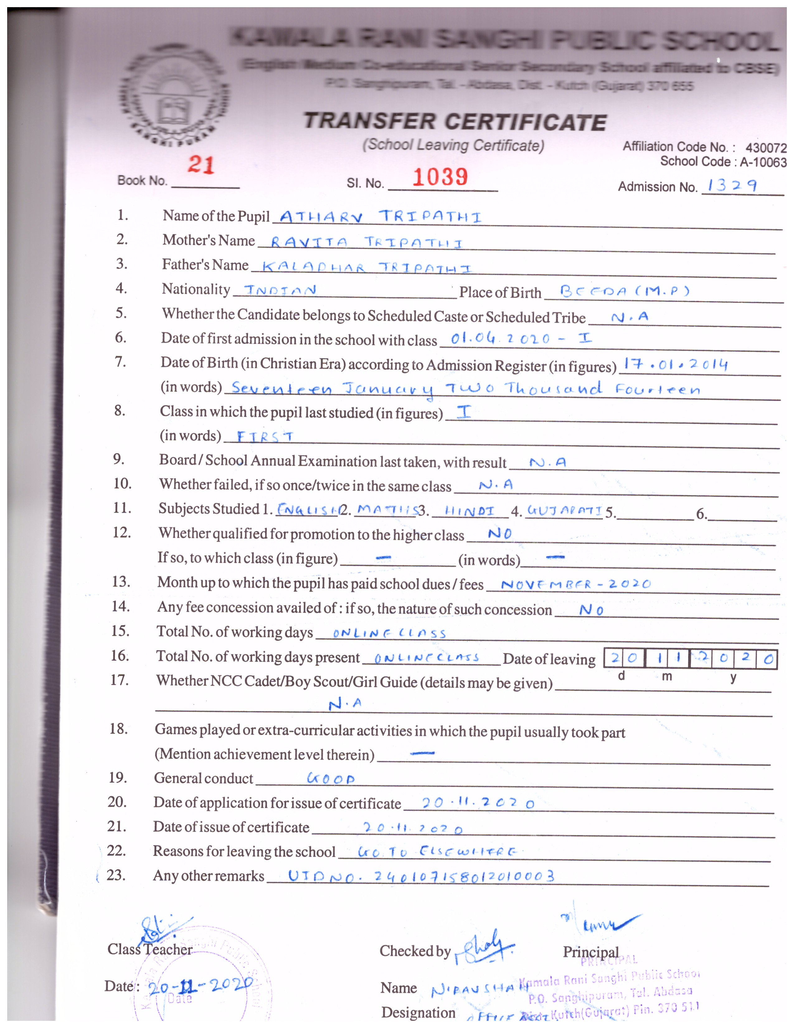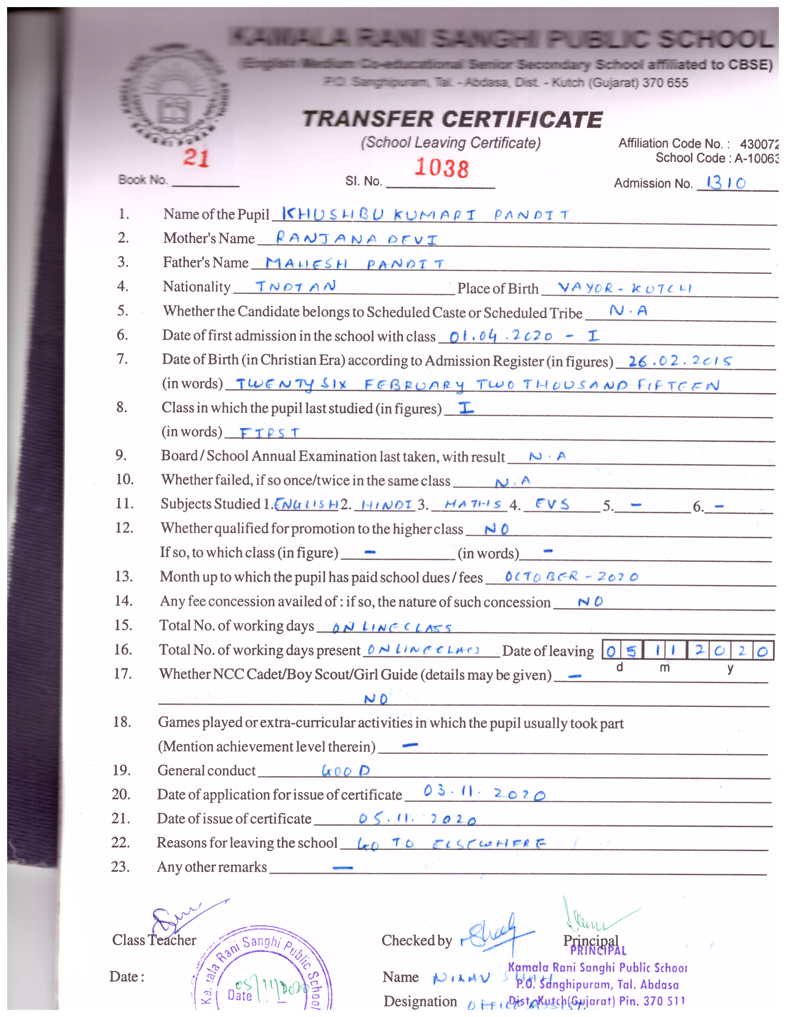 | Ayushi Sharma | IX | 2020-2021 |  |